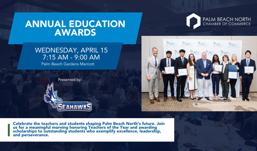 Join the Palm Beach North Chamber of Commerce and the Palm Beach North Education Foundation as we celebrate stellar teachers and students for their hard work and dedication at our 'Business Before Hours: Annual Education Awards' on Wednesday, April 15, 2026. This special event will recognize exceptional teachers who make a lasting impact in the classroom and students who demonstrate academic excellence, leadership, and perseverance. In recognition of their hard work and dedication, we will proudly present scholarships to deserving students and honor our Teachers of the Year. Don't miss this uplifting celebration of education and achievement!